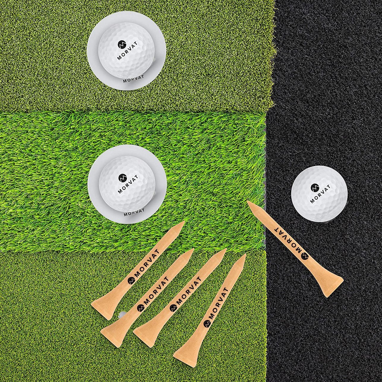 Enhance your swing with Morvat's golf mat/net set for home use, featuring a hitting mat (25" x 16"), training aids, 2 adjustable plastic tees, 5 wooden tees, and 3 golf balls. Practice from any lie with three grass levels—fairway, rough, and tight. Designed for durability, it withstands thousands of swings without damage. The thick rubber base keeps it stable during practice, and its portability ensures no limits to your golf training, backed by a 1-year warranty.