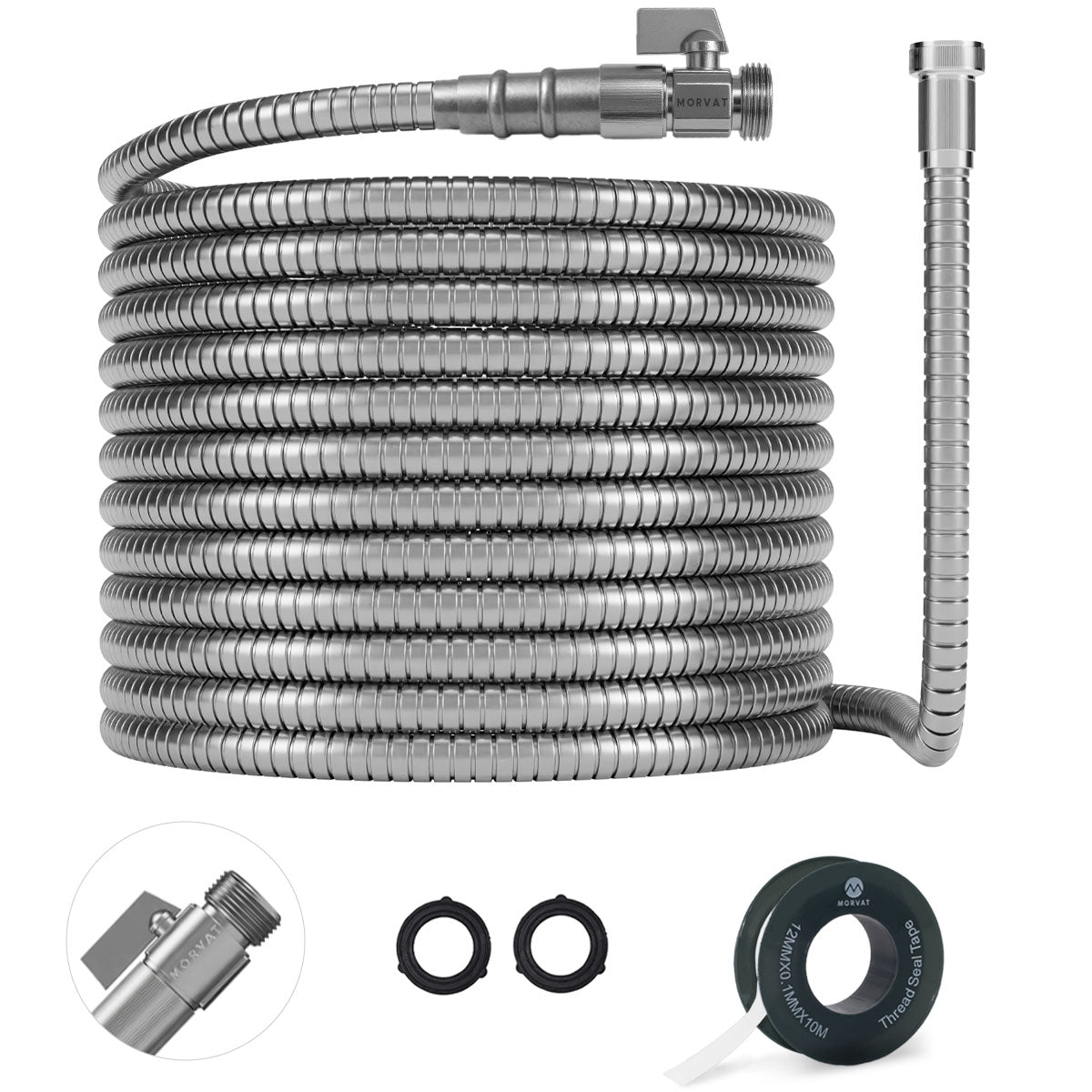 Regular price $21.99Morvat's stainless steel garden hose offers extreme durability, stopping kinks, rust, and more! The triple-reinforced PVC inner hose shields from sun, rain, and snow. Nickel-plated connectors enhance the robust brass. Experience high performance with a steady, leak-proof flow at 115 PSI. Easily navigate tight corners with the flexible metal pattern. Lightweight and sleek for convenient use and transport. The built-in on/off valve eliminates unnecessary trips. Includes Stainless Steel Hose, Teflon tape, and extra washers. Backed by a 1-year warranty.