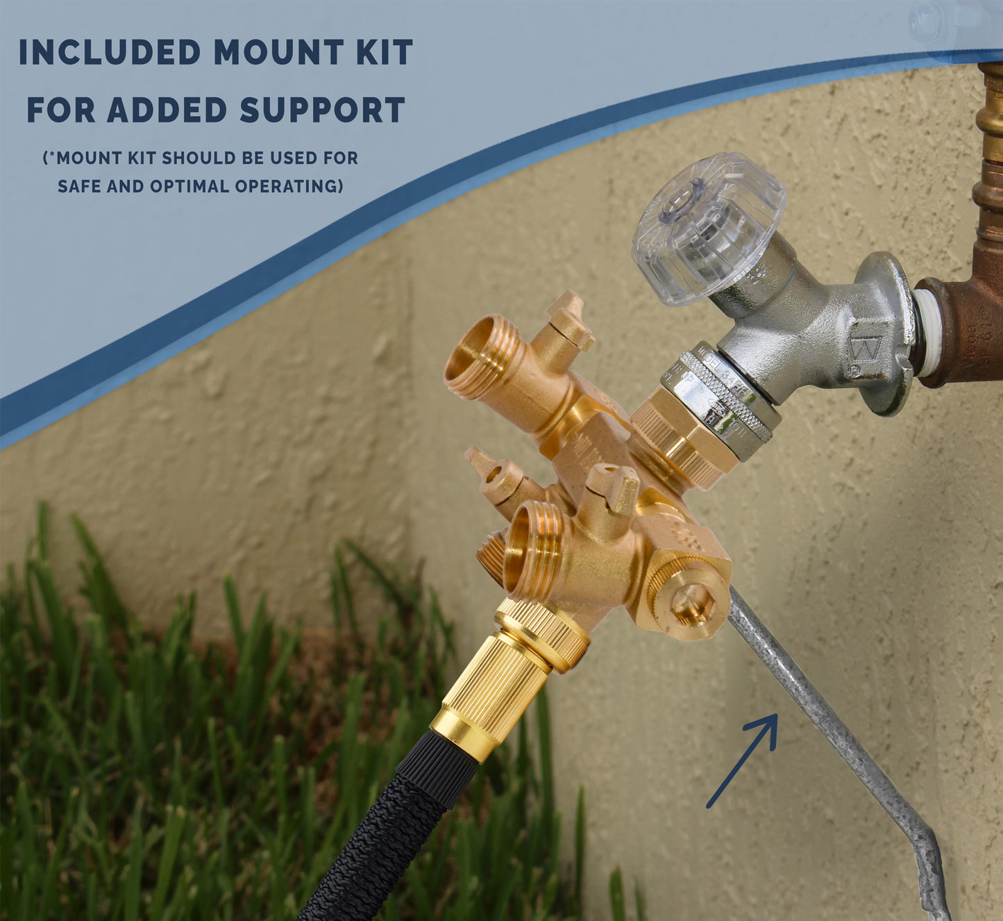 - INCLUDES: 1x 4 Way Hose Splitter, 1x Mount Kit (highly recommended to install), 1x Roll of Teflon Thread Seal Tape, 8x Extra Rubber O-Ring Washers.