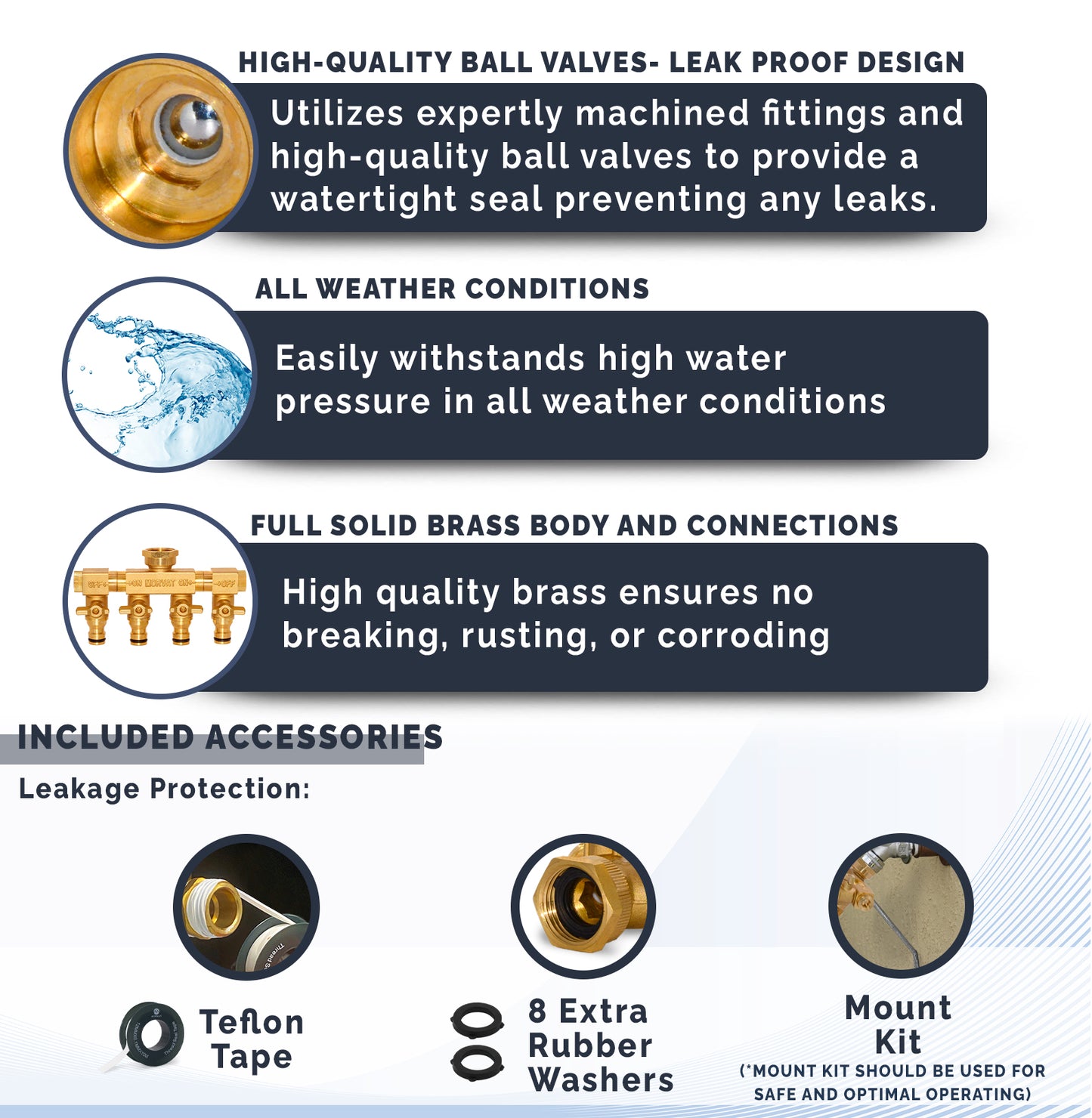 - SUPERIOR QUALITY: The durable & solid brass connector easily withstands high water pressure in all outdoor conditions without breaking, rusting, or corroding. Utilizes expertly machined fittings & high-quality ball valves to provide a watertight, leak-free seal to any faucet or spigot. A 250PSI burst strength ensures this manifold connector will last!