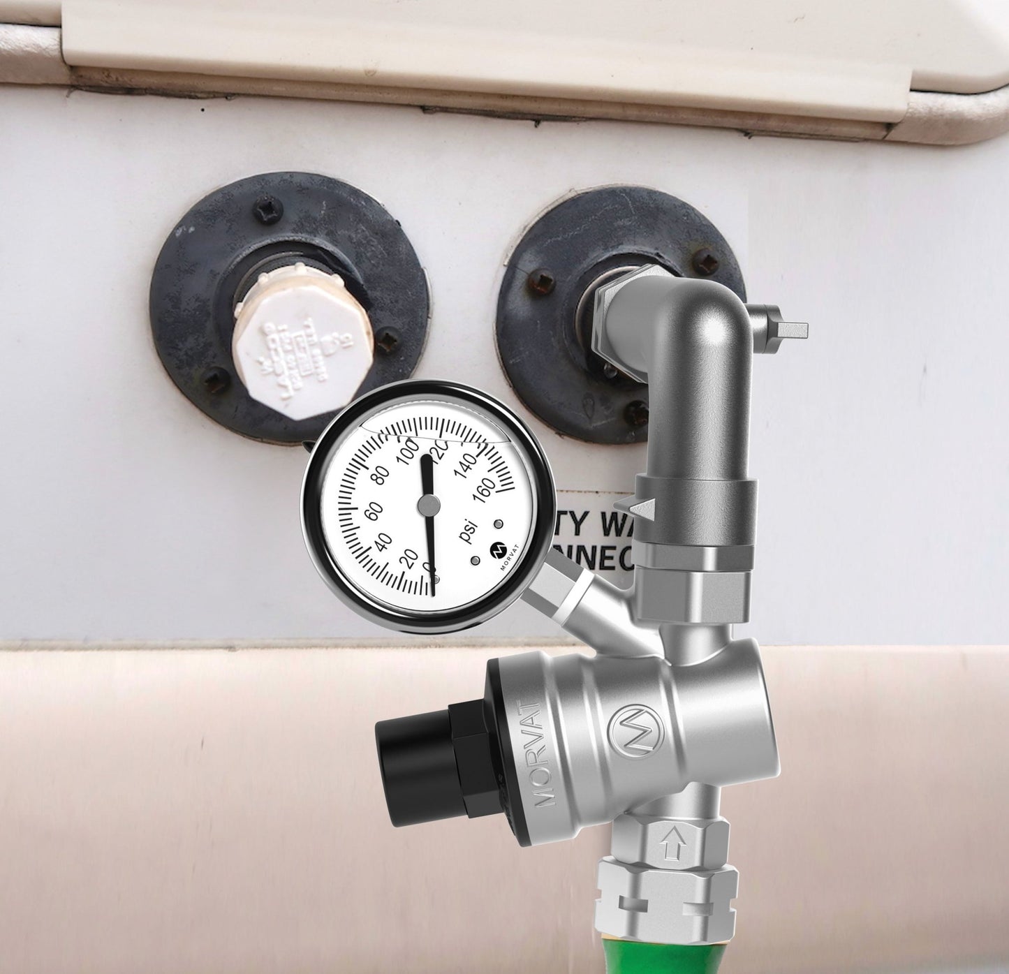 - HEAVY DUTY REGULATOR- Keep your RV & camper systems safe by reducing strain & preventing damage caused by high water pressure. Easily adjustable from 0-160 psi. Made from rust-free durable brass to ensure longevity & strength. Fitted with US Standard NH 3/4" threads.