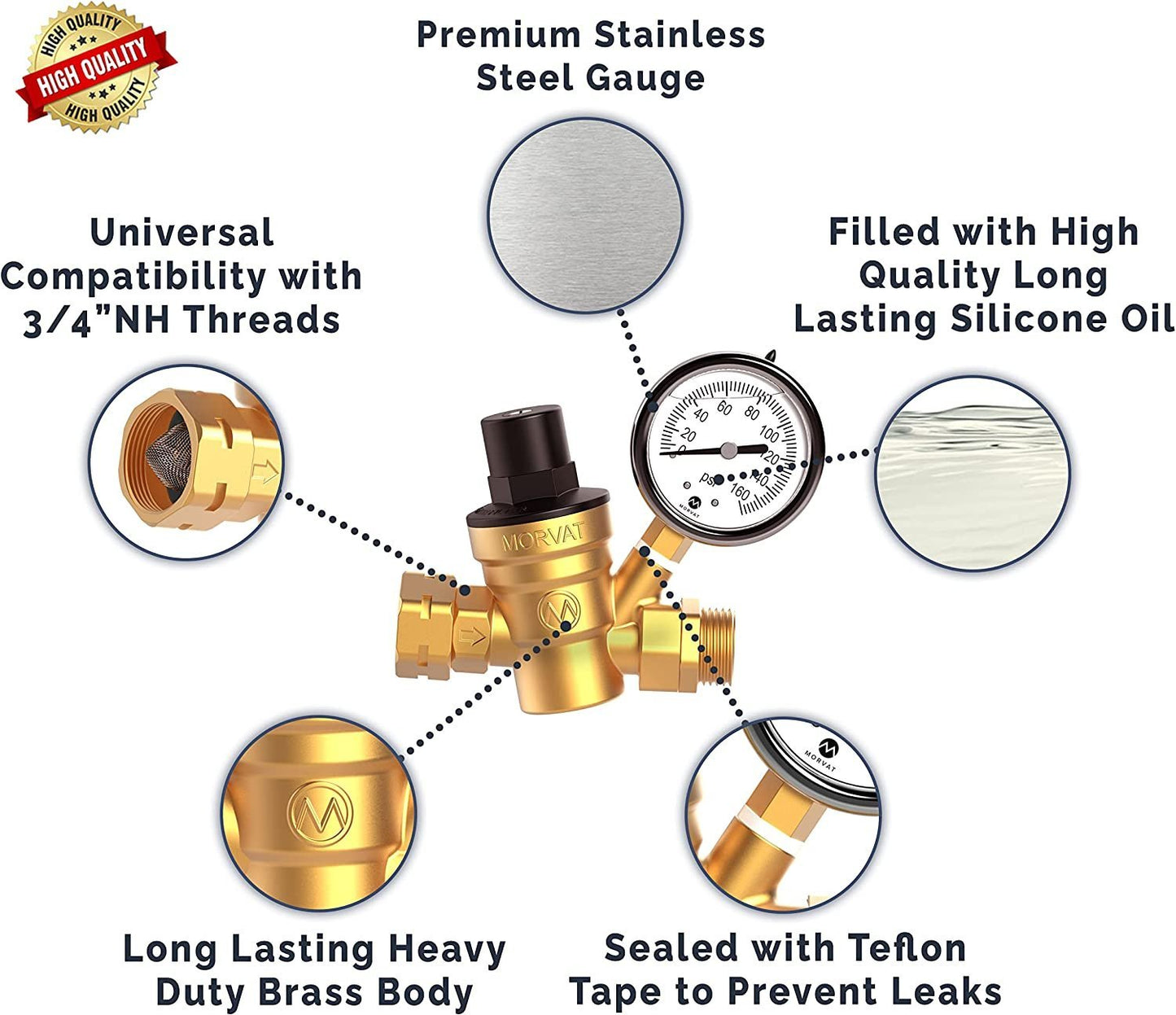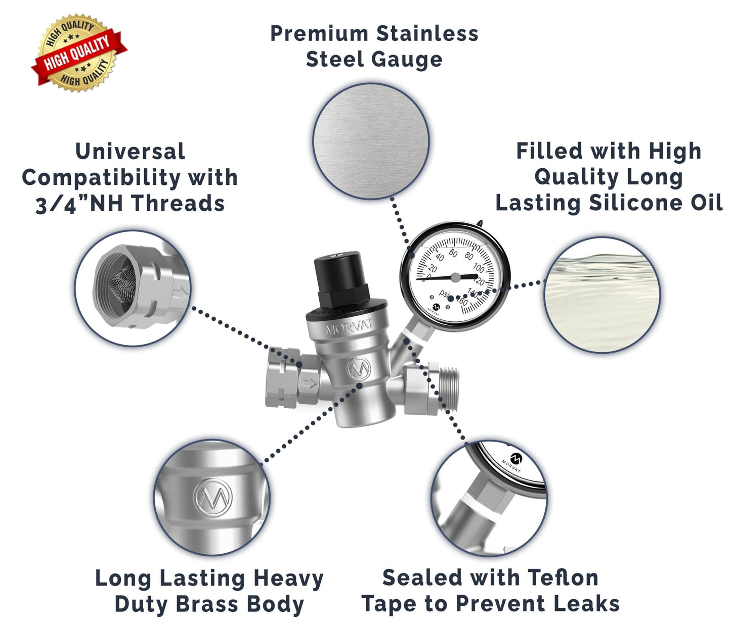 Morvat Adjustable Lead-Free Brass RV Water Pressure Regulator with Oil Gauge