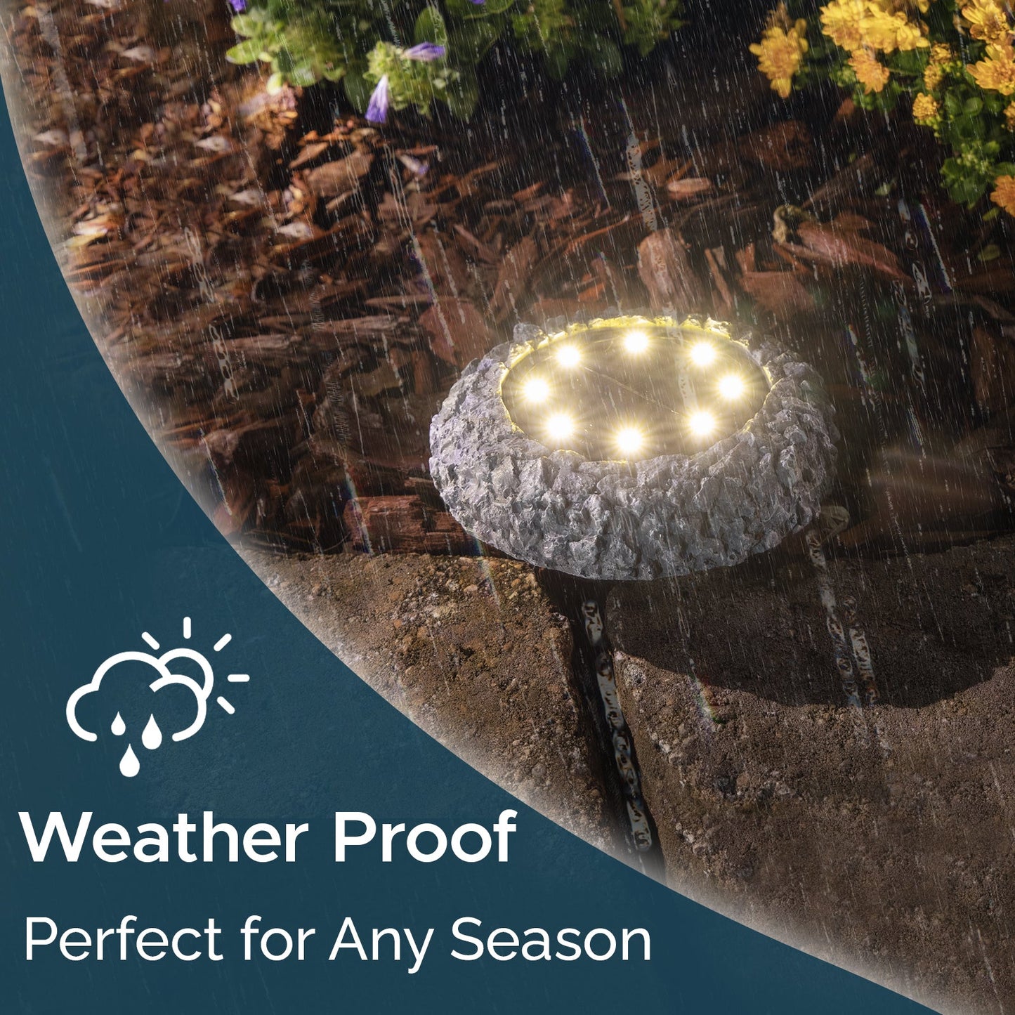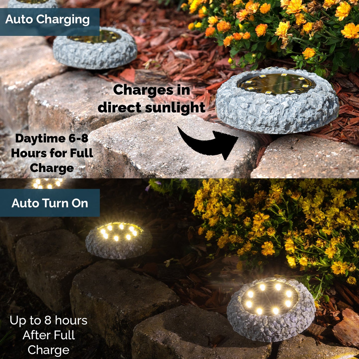- SOLAR POWERED- Outfitted with high-performance LED lights & auto sensors, these rock spot path lights turn on automatically at night & off at dawn, supplying 6-8 hours of illumination when fully charged. Simply place these energy saving lights into direct sunlight & they will auto charge during the day.
